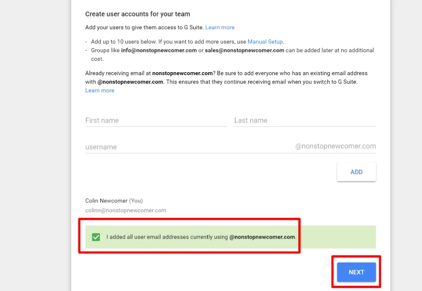 In the next step, you’ll finish the G Suite setup by adding users and connecting it to your website or domain name. Once you reach the set-up screen, you will be asked to add more people to your account. If you want to create more accounts for different departments, you can do that here.